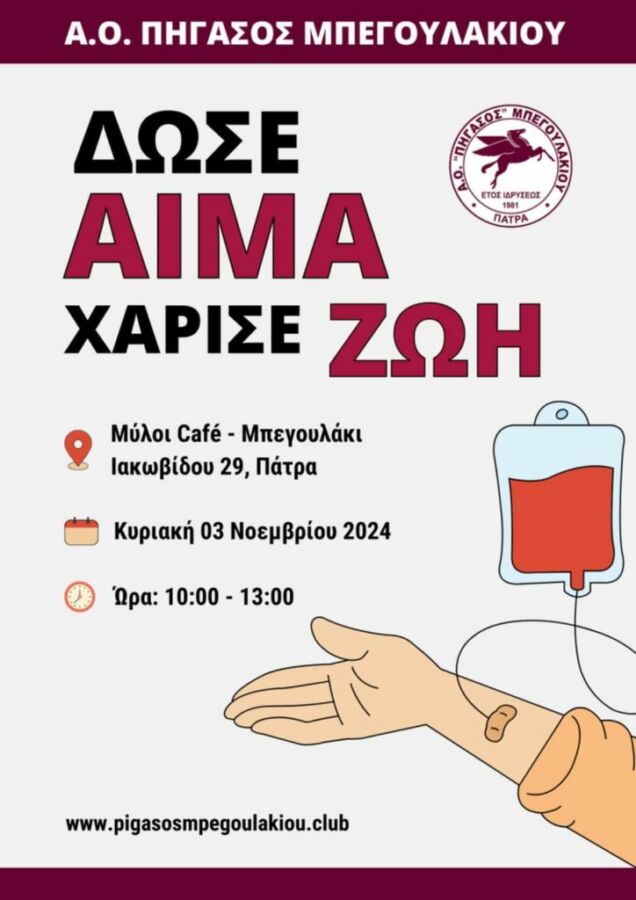 Για ακόμα μια χρονιά η ομάδα του Πήγασου Μπεγουλακίου δείχνει το κοινωνικό του πρόσωπο διοργανώνοντας αιμοδοσία.