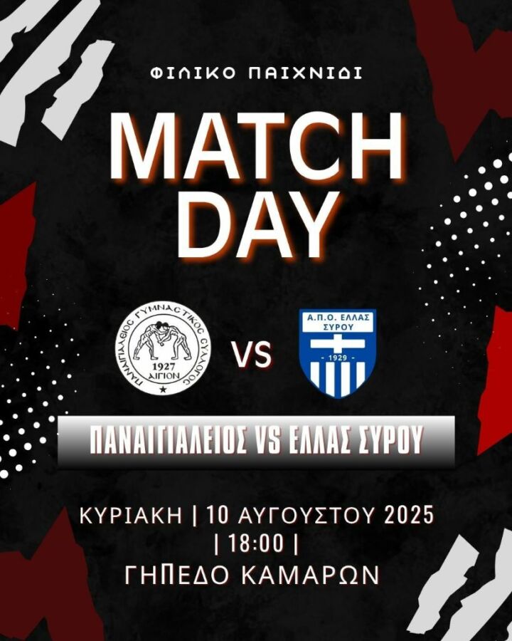 Ο Παναιγιάλειος Γυμναστικός Σύλλογος ανακοινώνει με χαρά τη διεξαγωγή του πρώτου φιλικού αγώνα την Κυριακή 10 Αυγούστου 2025, στις 18:00 στο γήπεδο Καμαρών με αντίπαλο την ομάδα της ΕΛΛΑΣ ΣΥΡΟΥ.