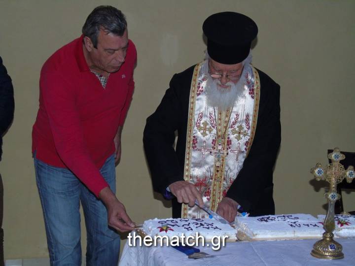 Αμέσως μετά το τέλος του αγώνα με την Αναγέννηση, ο Πανμοβριακός έκοψε σε μαγαζί του Ρόλου τη πρωτοχρονιάτικη πίτα του.