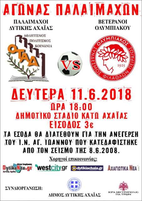Γι αυτό τον ιερό σκοπό την προσεχή Δευτέρα στις 18:00 το απόγευμα στο Δημοτικό στάδιο της Κάτω Αχαγιάς θα γίνει φιλικός αγώνας μεταξύ των παλαιμάχων της Δυτικής Αχαΐας και των Βετεράνων του Ολυμπιακού Πειραιώς.