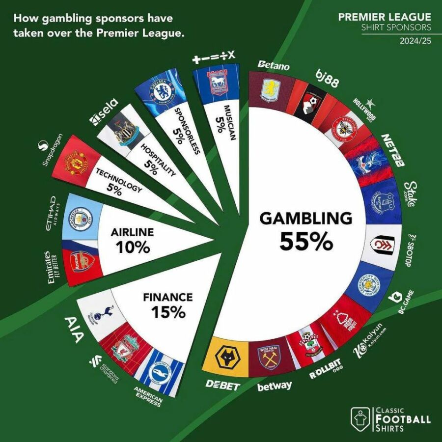 Όπως δείχνει περίτρανα η συγκεκριμένη εικόνα, το 55% των ομάδων της φετινής Πρέμιερ Λιγκ (δηλαδή 11 στους 20 συλλόγους του πιο ανταγωνιστικού πρωταθλήματος του κόσμου) έχουν ως βασικούς χορηγούς στις φανέλες τους στοιχηματικές εταιρείες.